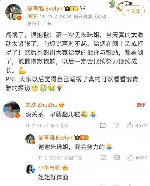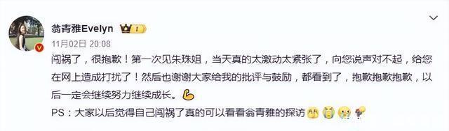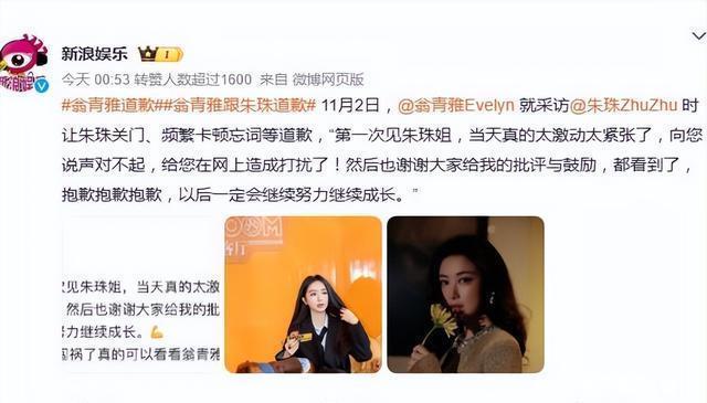 热搜“翁青雅道歉”与朱珠轻描淡写的“早就翻儿啦”,共同拼凑出一场跨界主持风波的全貌。11月2日,因采访朱珠时表现失误而被推上风口浪尖的翁青雅,在社交平台发文致歉,称自己“太激动太紧张”,并对朱珠表达歉意。而朱珠大度回应之下,这场始于11月1日的“社交灾难现场”,却折射出流量时代跨界者面临的严峻考验。